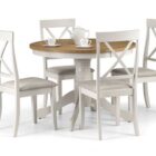 A new addition to the Daventry dining range, round table and 4 chairs in an ivory finish with a light oak veneer table top. Chairs fully assembled.