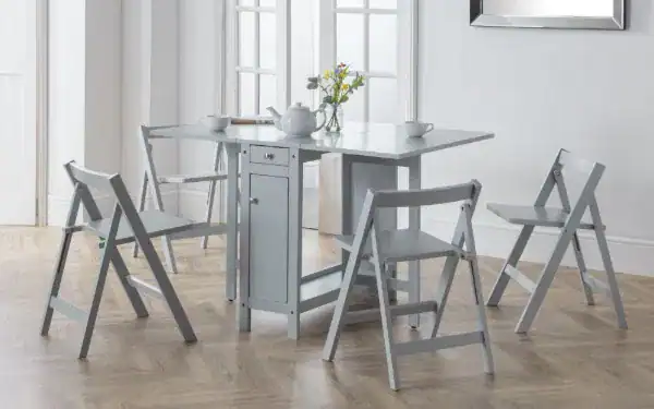 The savoy dining set is known as a butterfly set which has a fold down table and 4 folding chairs what fit inside the table, it also has a cutlery drawer. Made of solid hardwood in 4 finishes, white/natural finish, light oak finish, dove grey and black.