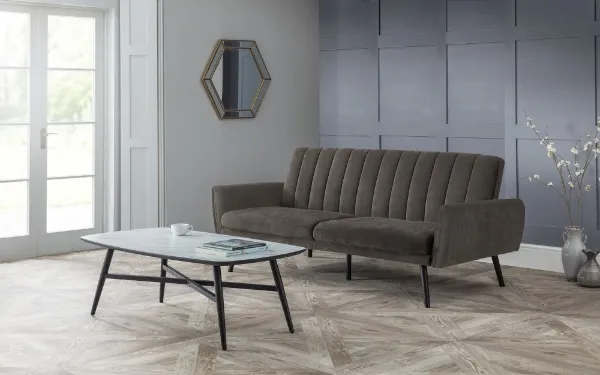The Africa click clack sofa bed is upholstered in a grey or blue velvet with a classic statement stitched vertical rows on the back with black tapered legs. The easy to use sleeper function offers a guest bed with the utmost comfort with padded cushions.