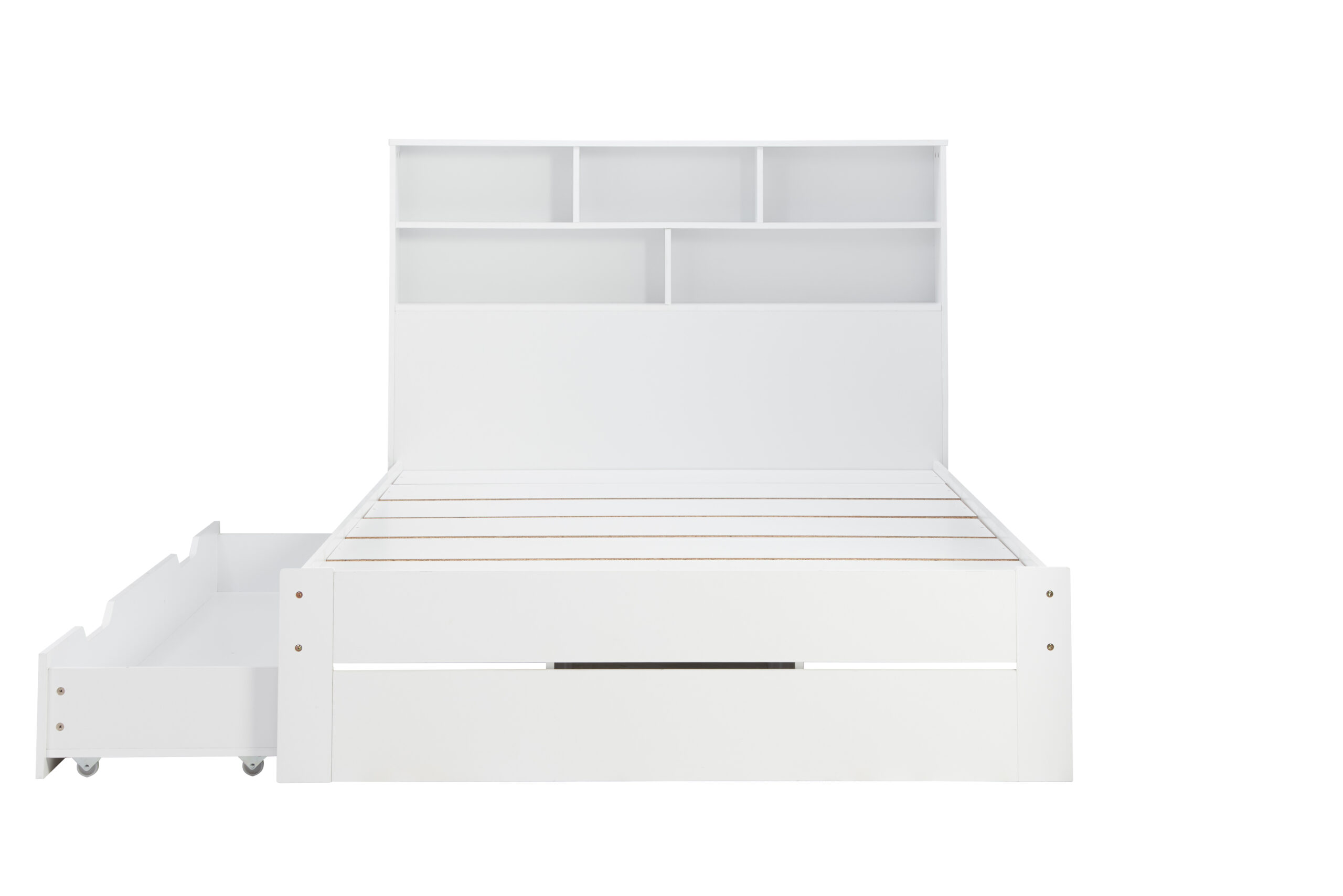 The Alf storage bedframe is a wooden mdf bedframe finished in white. Overhead storage for books etc and 1 large drawer on castors underneath for more storage. Boxed for home assembly, available in 3 sizes 4′, 4’6, 5′ .