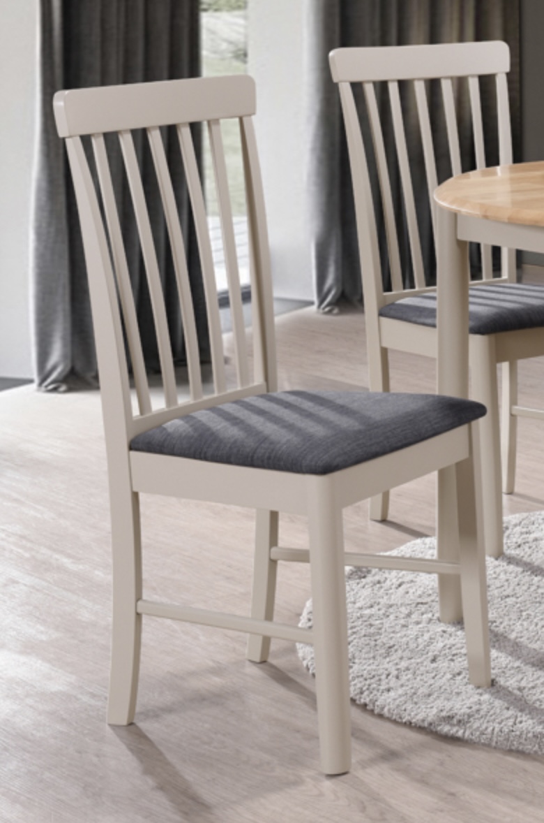 Altona dining chairs are made of solid hardwood and painted in stone grey with charcoal fabric seats.