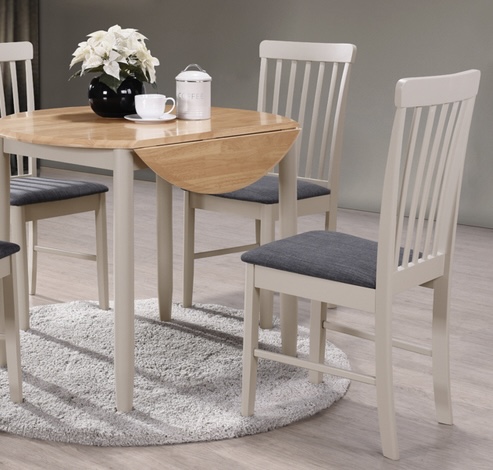 Altona collection with light oak tops, in solid hardwood, stone grey painted. Chamfered table tops with rounded legs. Chairs have charcoal fabric seat pads.