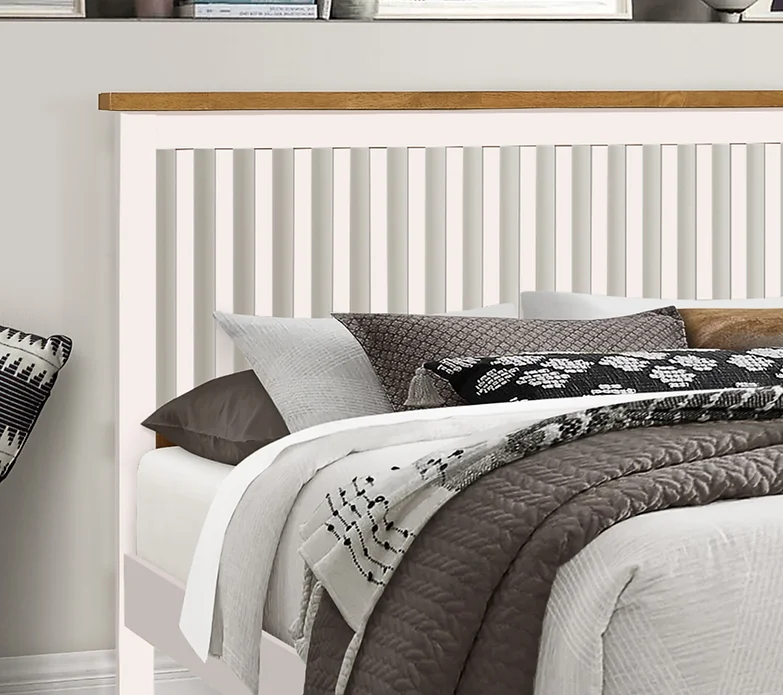 The Ascot is a stunning bed frame featuring two contrasting styles. One of the many appeals of the bed frame is that it’s tailorable to either traditional or modern styled bedrooms, the crisp white finish epitomises a clean and stylish aesthetic, whereas the natural wooden option showcases a rustic finish adding charm and warmth to the bedroom. The slatted headboard illustrates the bed’s beauty, with the shaker style adding intricate detailing to the bed frame. Made of Hevea hardwood which is durable and robust as well as environmentally friendly. With a sprung slatted base for comfort and support. Sizes available 3′, 4’6, 5′ in both colours.