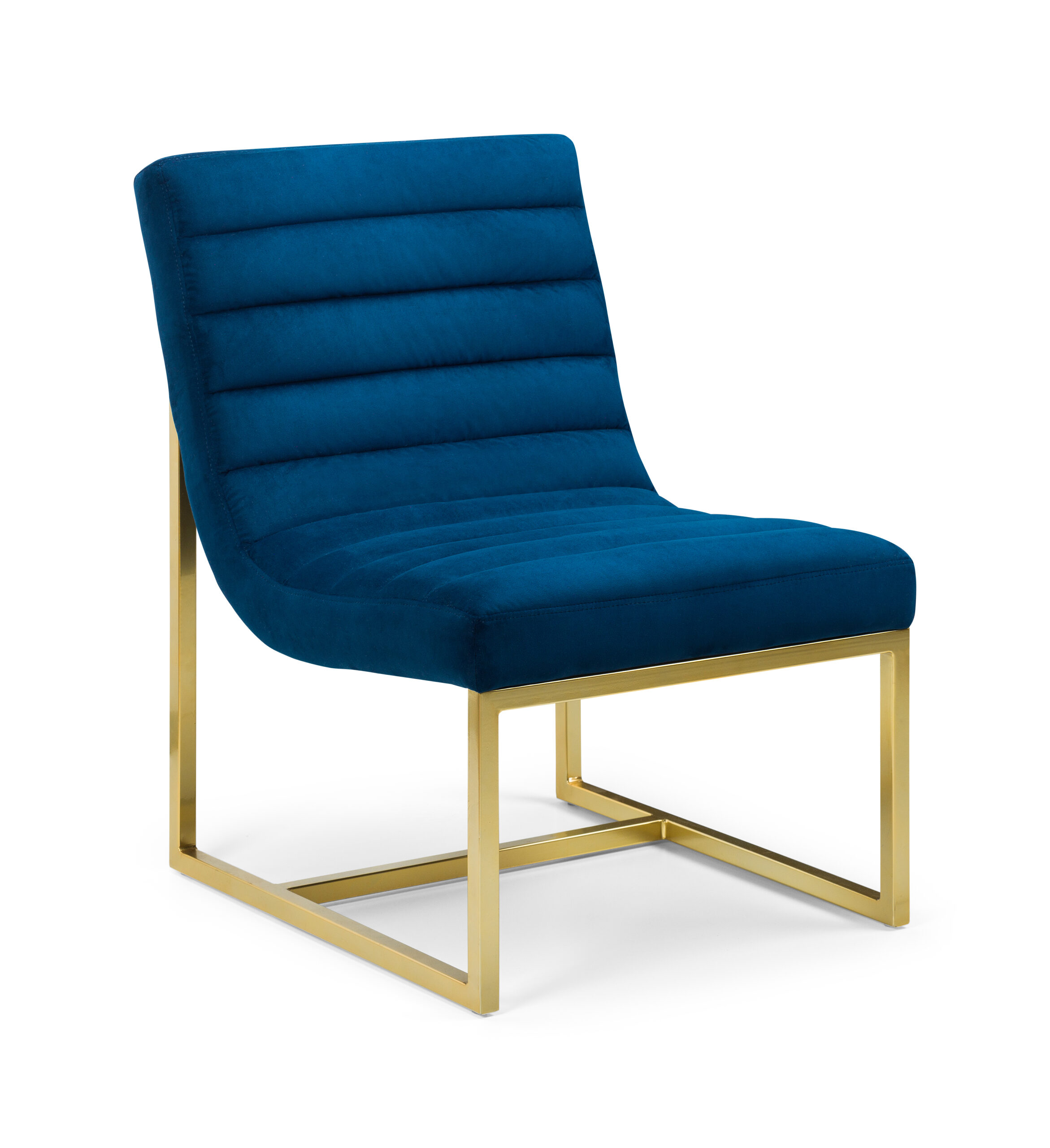 The Bellia accent chair is upholstered in a stunning blue velvet fabric upon a modern gold frame suitable for a wide range of modern and contemporary spaces.