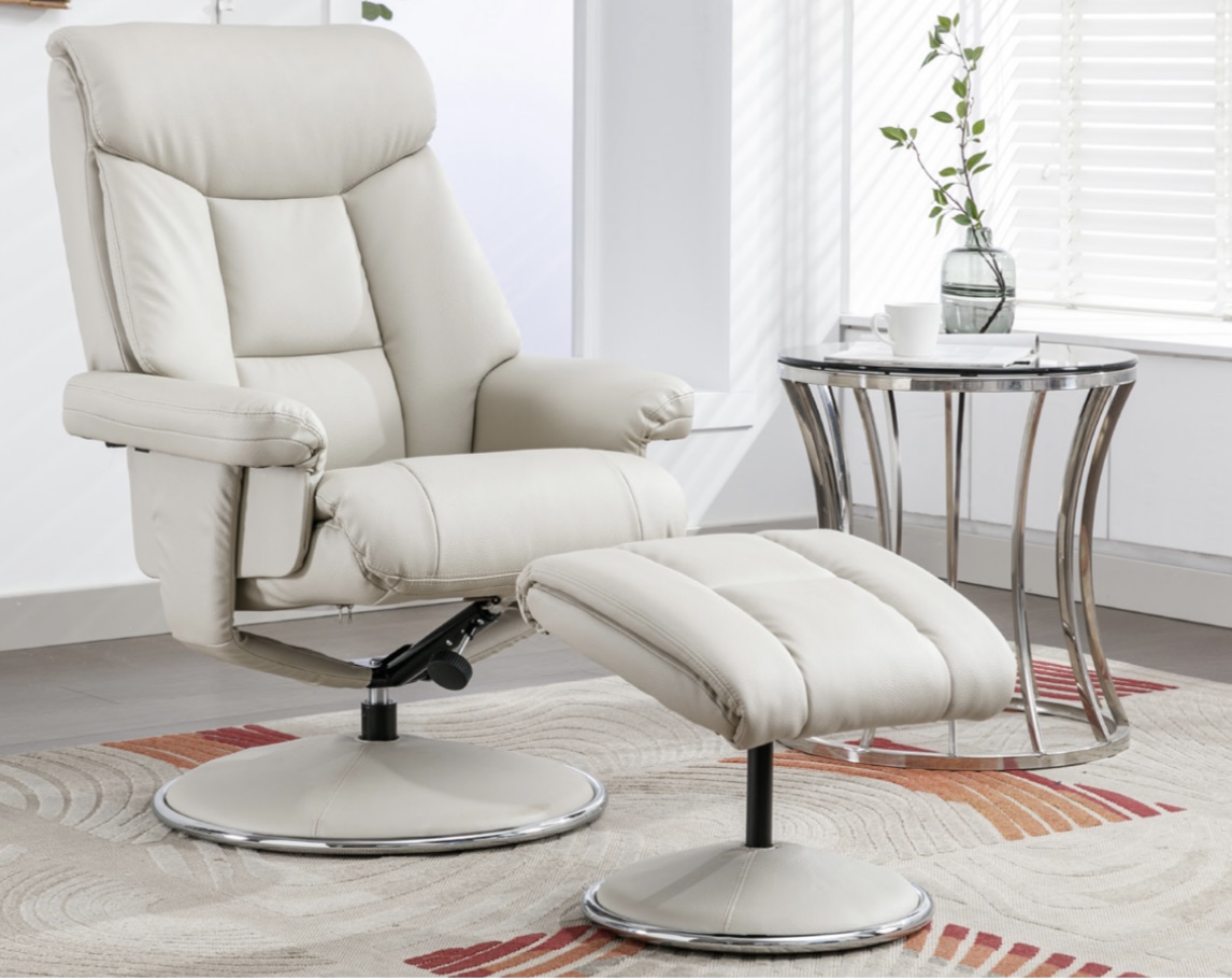 Biarritz plush leather look swivel and recline chair is available in colours 6 colours, cinder, mushroom, olive green, navy, grey and pebble with a matching round base. Boxed for home assembly.