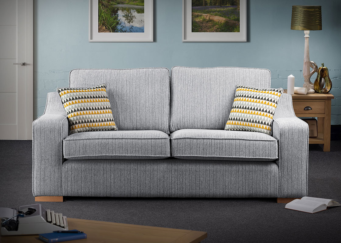 The Blenheim Sofa-bed is a two seater sofa-bed which has a luxury feel with high density foam wrapped in a deep layer of polyester fibre for seating and hollow fibre back cushions for comfort. The frame is a hardwood with all joints glued and stapled complete with a tension sprung base. A choice of three textured weave fabrics with two complimentary scatters on each sofa. A choice of light or dark wooden legs. Also available in two seater sofa, three seater sofa, armchair, corner group and corner group with sofa-bed. British made with a 5 year frame guarantee.