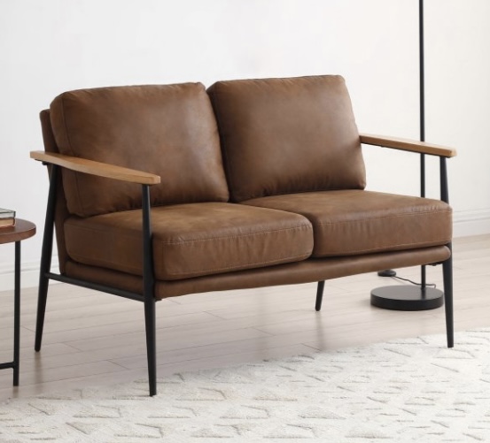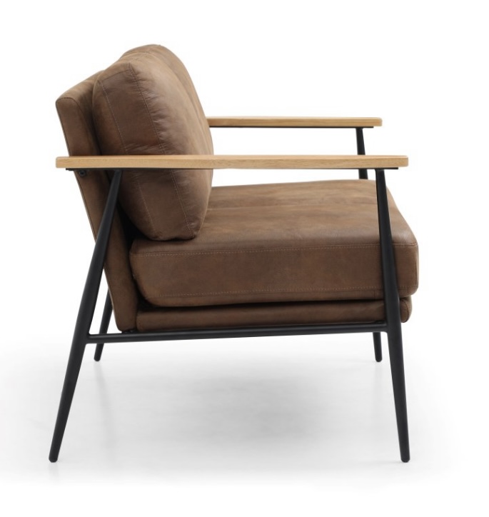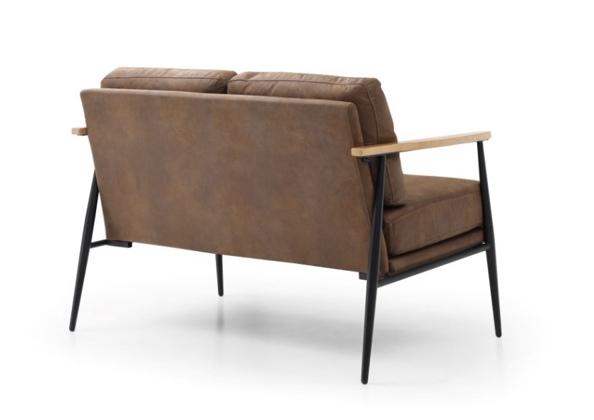 Bronx 2 seater sofa made of brown faux leather with two tone wooden frame.