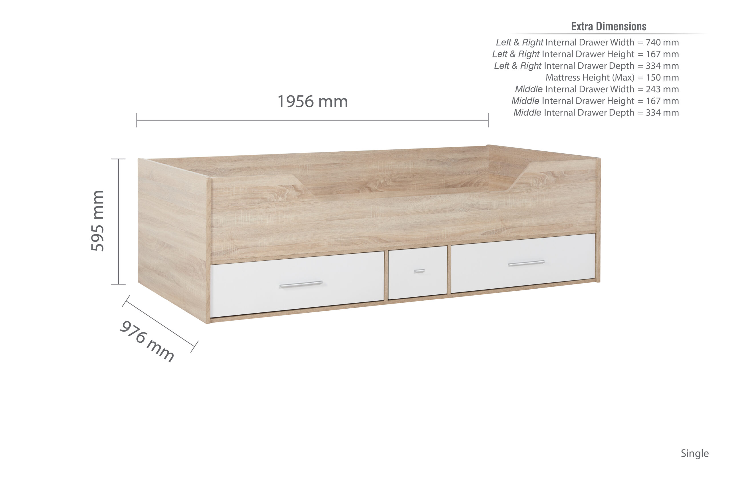 The Camden cabin bed is ideal for the smaller rooms looking for storage and sleeping. The bed consists of 3 drawers and is constructed from chipboard with a base for additional sturdiness, in a white and oak finish. Boxed for home assembly, requires a standard 90 x 190cm mattress.