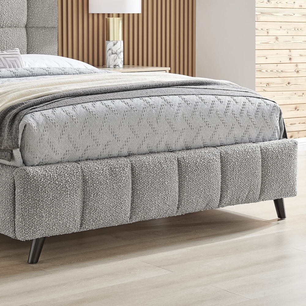 The chic bedframe is a stunning but simple design with a 135cm tall headboard. Finished in luxurious boucle fabric in ivory or dove grey. Wooden slatted base with dark wooden feet. Available in double and king size. Boxed for home assembly.