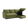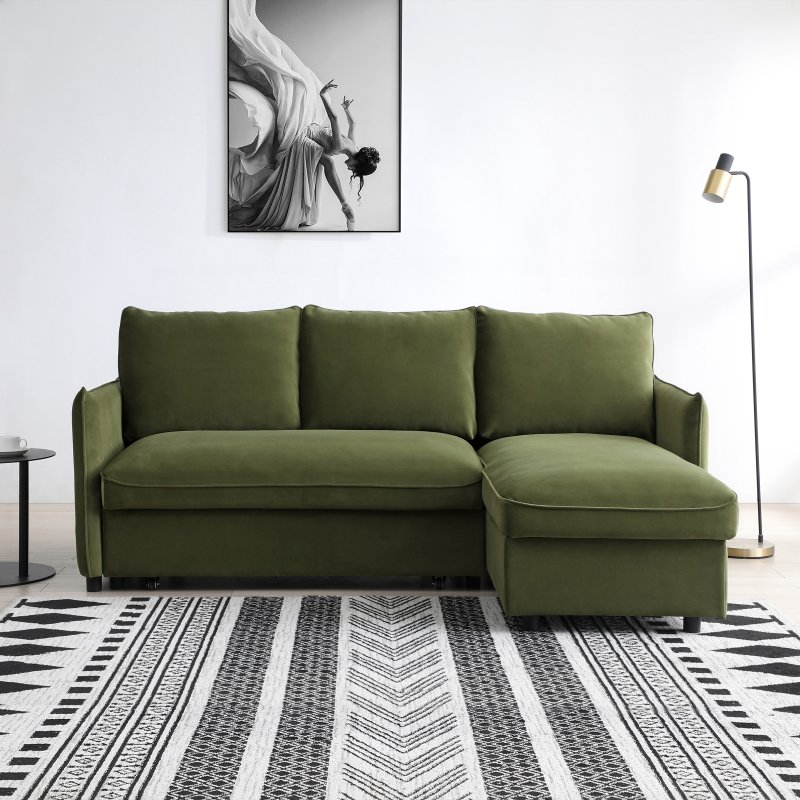 The Claire corner sofa-bed has a ultra soft back and has seating with piping detail. The pull up pop up section creates reclining or sleeping space and storage can be found within chaise. In velvet orange and olive green and grey boucle fabrics. Also available as a two seater sofa bed.