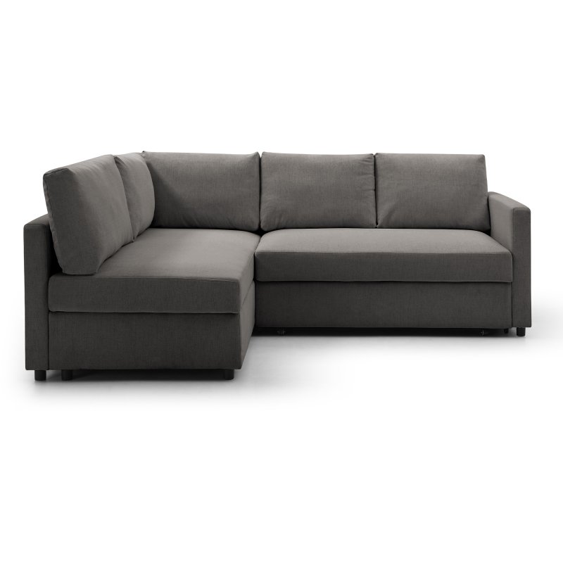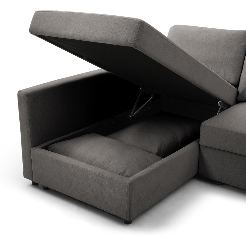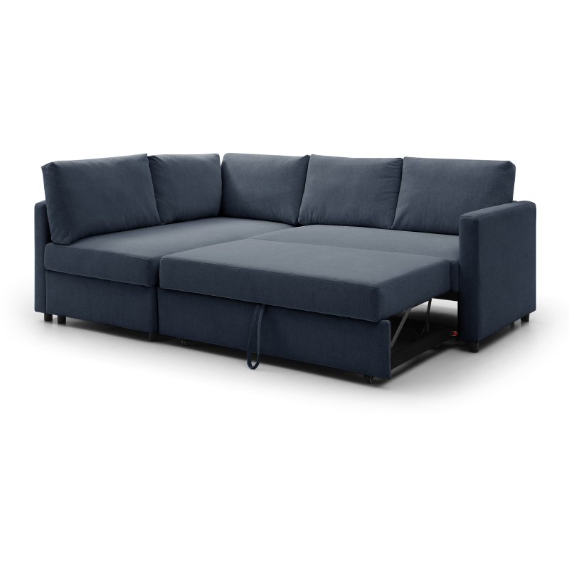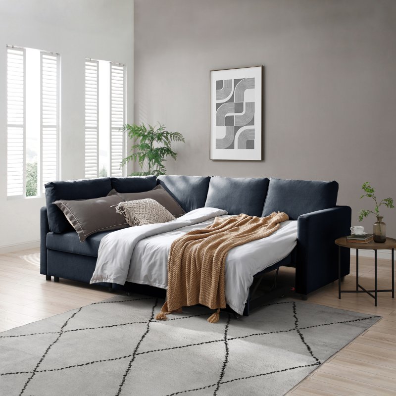 The Clara Sofa-bed is a striking corner sofa-bed featuring a convenient pop-up mechanism that effortlessly converts into a full king -size sleeping area. Designed with clean, straight lines and set on discreet low black feet, it offers a contemporary, minimalist look. Comfortable seating and a plush backrest ensure everyday comfort, while practical storage beneath the chaise provides space for blankets or extra pillows. This versatile piece is perfect for guest sleeping or enhancing movie nights at home. Finished in an easy-clean weave fabric, available in natural, navy and grey.