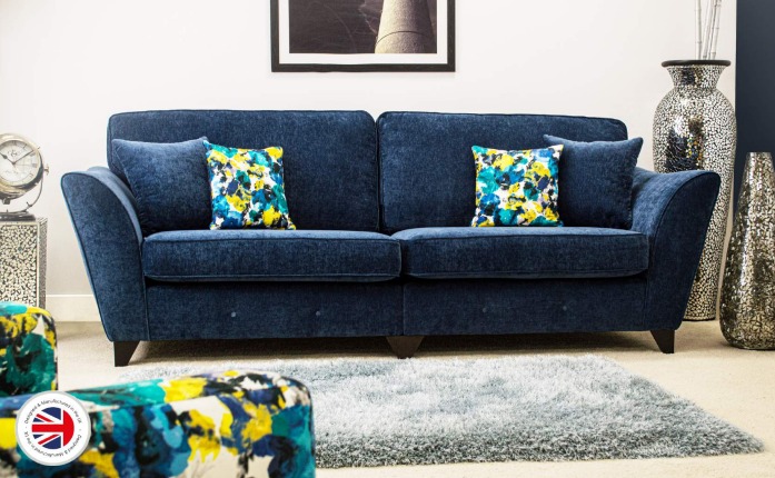 The Cosmos is a British made sofa collection with sofas available as a 4, 3, and 2 seater, matching stool, love chair and contrasting accent chair to compliment the range. Solid birch wood frames, foam with fibre top seat cushions and back cushions are filled with conjugate hollow white fibre for comfort. Dark wooden legs, 4 seater delivered in 2 halves. Choice of 5 colours Navy, Gold, Charcoal, Ice silver and emerald with 4 FREE scatters per sofa.