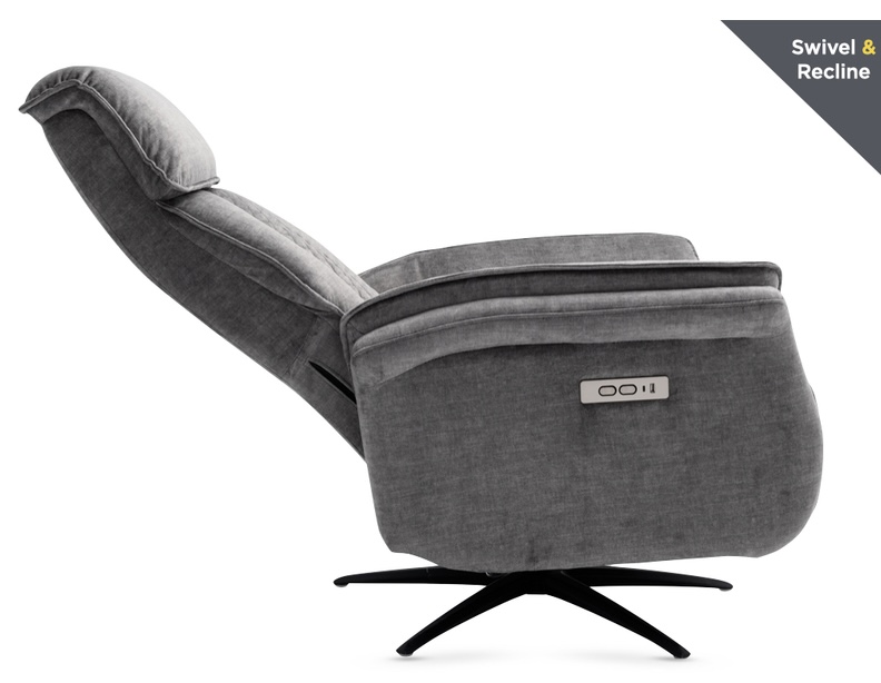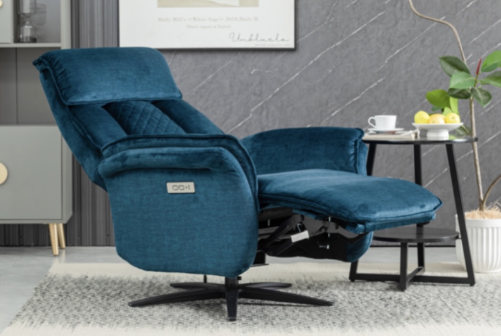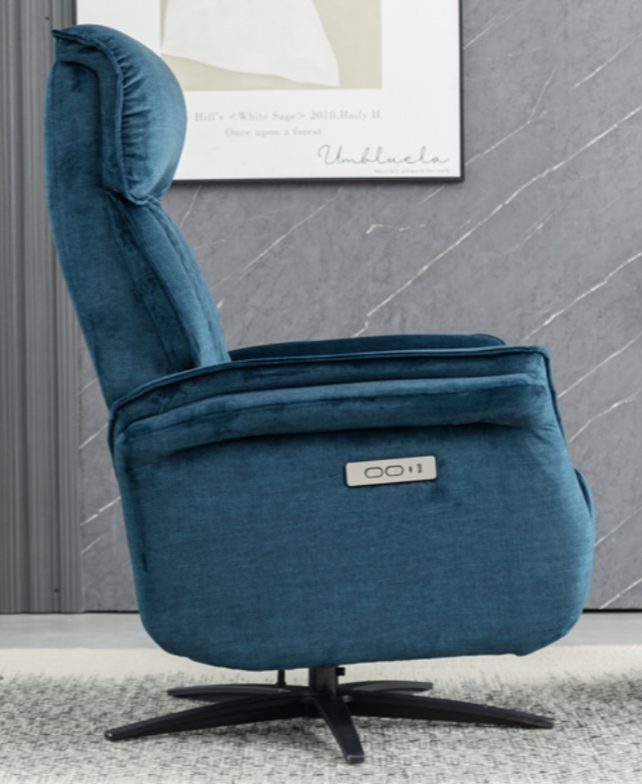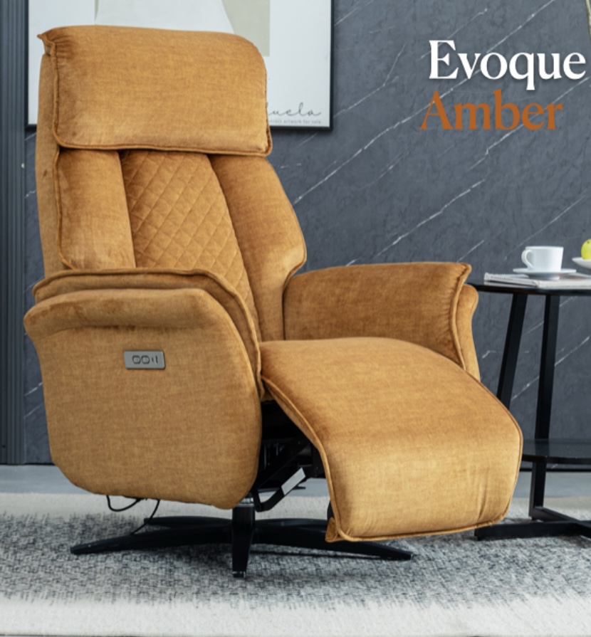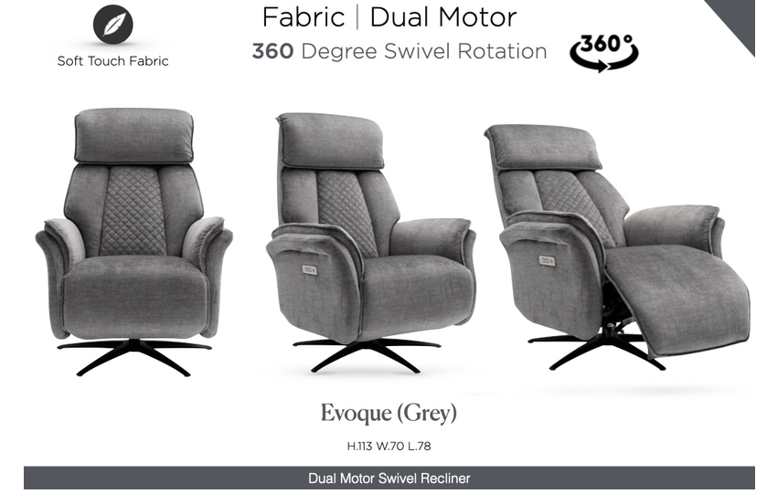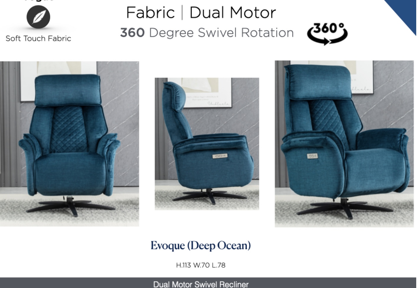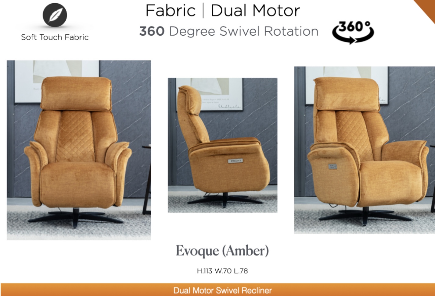 The evoque swivel lounge chairs with dual motor offer the ultimate of comfort. With independent controls for the backrest and footrest, you have complete control over your seating arrangements. Crafted with meticulous attention to detail, these lounge chairs exude luxury and sophistication. The plush cushioning provides exceptional support while the premium upholstery adds a touch of elegance to any room. Available in three on trend colours, amber, ocean blue and grey, with a 360 degree rotation.