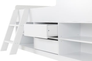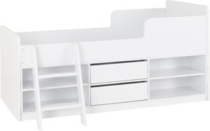Felix low sleeper bed, made of MDF, finished in sonoma oak effect, white and grey, can be assembled with ladder on either side, boxed for home assembly.