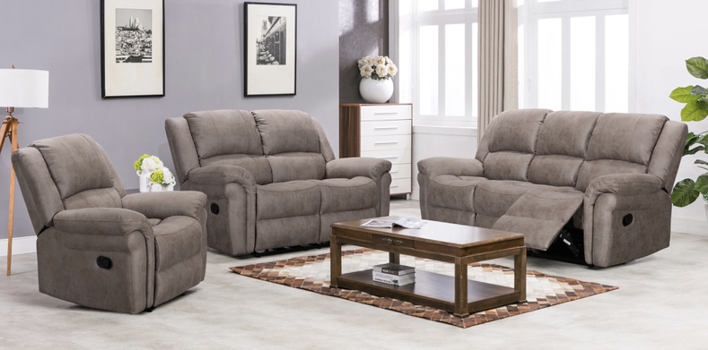 Stretch out and relax in the Gloucester reclining suite. A full mannual recline mechanism on the 3 seater sofa, 2 seater sofa and armchair combined with high rise back make this a dream to sit and relax on. The 3 seater sofa has a centre console with two cup holders build into the centre sectiona for ultimate convenience. Available in two colour choices, dark grey and dark taupe.