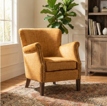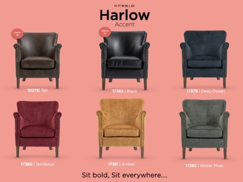 The Harlow accent chair is a classic style chair that will bring comfort and elegance to any room. Available in six vintage fabric colours, charcoal, caramel, copper, coral, pewter grey, and steel blue, and three leather air fabric colours burgundy, brown, and tan all with dark wooden legs.