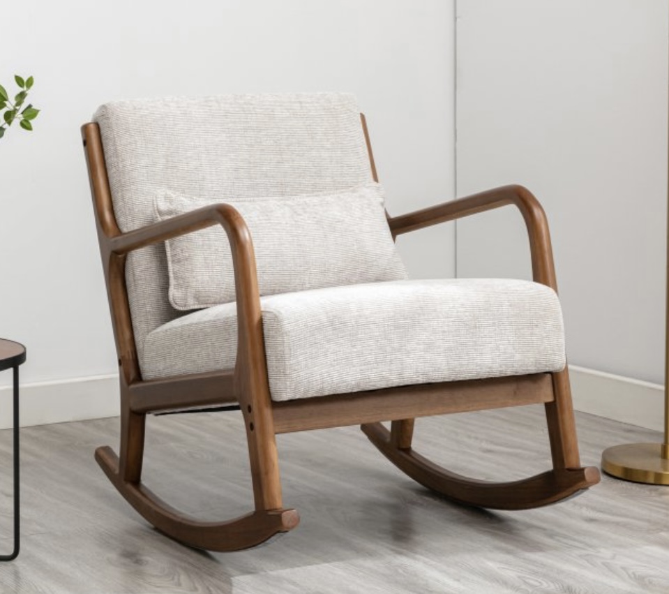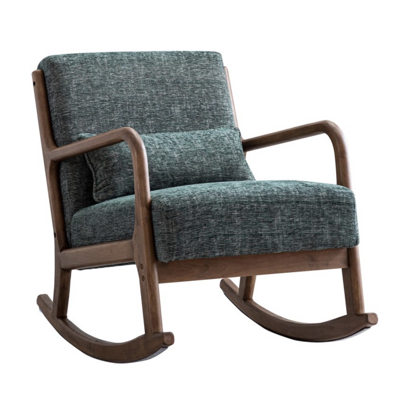 Inca rocker chair is a modern day rocking chair with padded back and seat with Bolger cushion, accented with a stained wooden frame. Available in chenille fabric in 3 colours, blue, green and natural.
