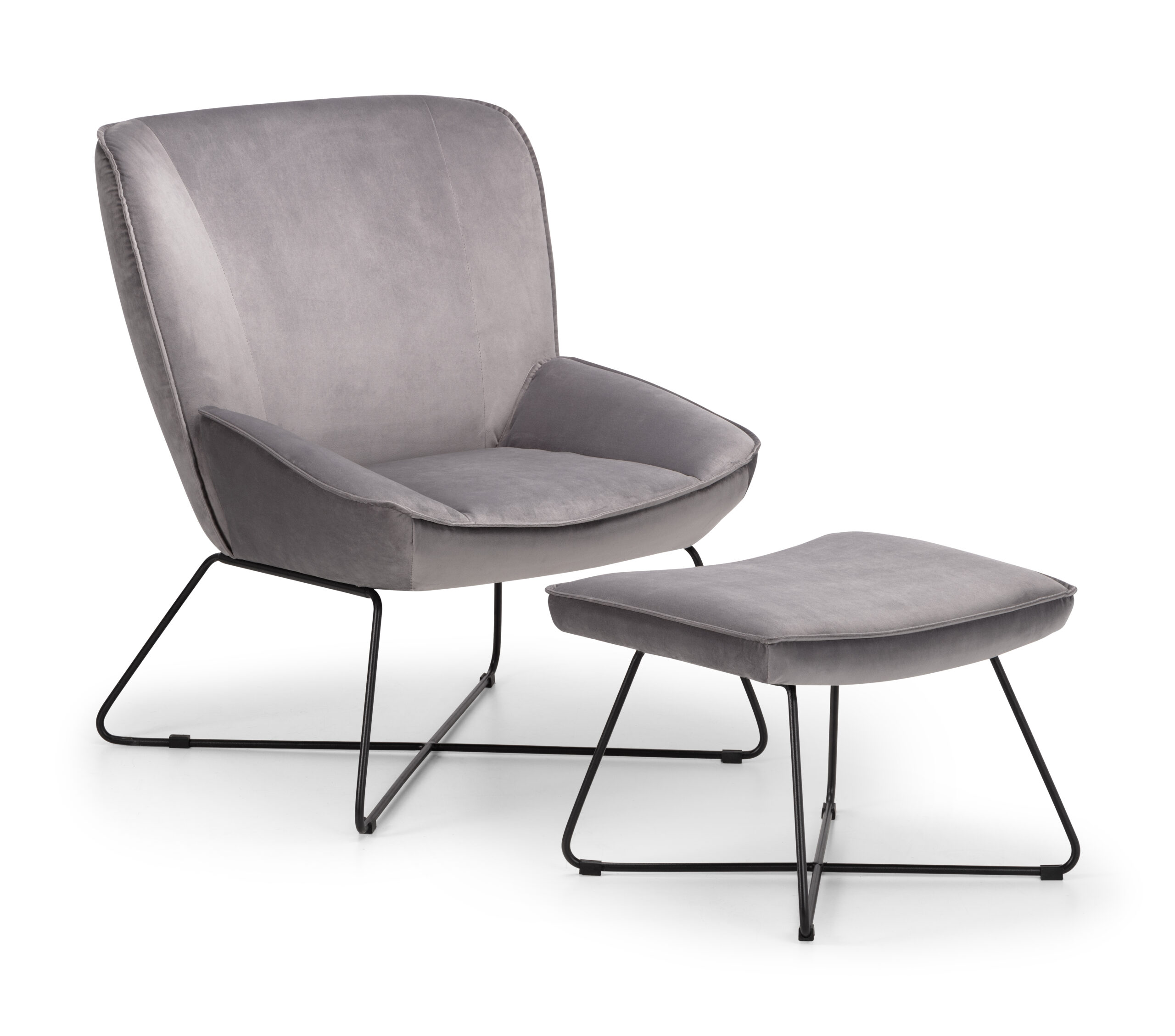 The Milla accent chair with matching stool finished in a grey or teal velvet finish.