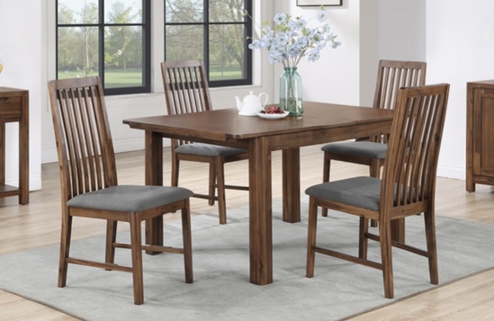 Experience the perfect fusion of classic charm and contemporary design with the Monterey acacia collection. Made of solid acacia and acacia veneer with rounded corners. Dining chairs have grey fabric seats.