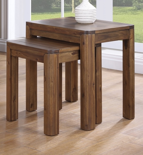 Experience the perfect fusion of classic charm and contemporary design with the Monterey acacia collection. Made of solid acacia and acacia veneer with rounded corners. Dining chairs have grey fabric seats.