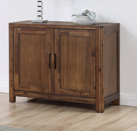 Experience the perfect fusion of classic charm and contemporary design with the Monterey acacia collection. Made of solid acacia and acacia veneer with rounded corners. Dining chairs have grey fabric seats.
