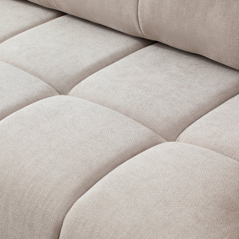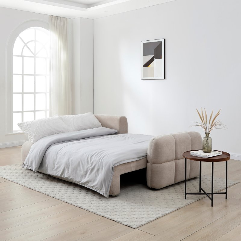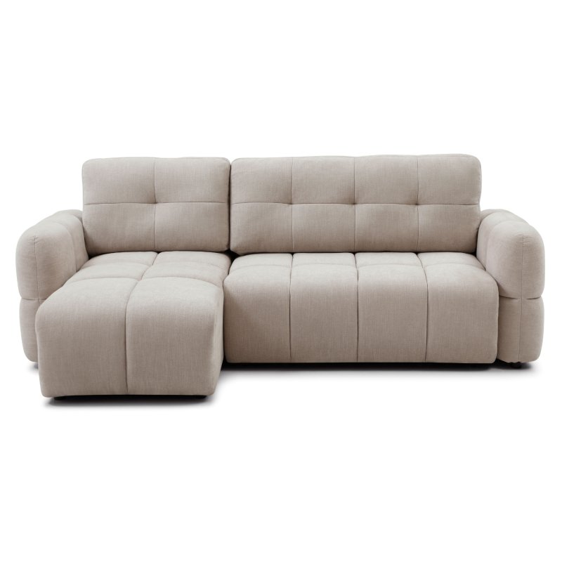 The Morgan Corner Sofa-bed is quilted with a lovely curved profile and plump seating. It includes a shallow storage under the seat for pillows or extra bedding and easily converts into a comfortable sleeping area. Designed to create a low, loungy feel with enveloping comfort, the piece is fully upholstered in soft taupe chenille fabric.