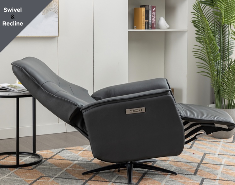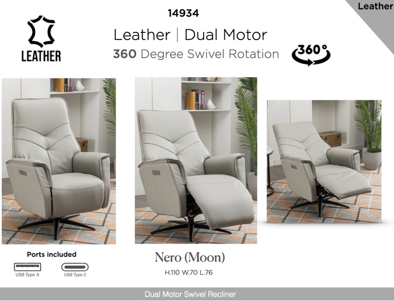The Nero electric power chair is a full leather swivel lounge chair with dual motor offer the ultimate comfort. With independent controls for both the backrest and footrest, you have complete control over your seating arrangement. Crafted with meticulous attention to detail, these chairs exclude luxury and sophistication. Available in two on trend colours, anthracite and moon with a 360 degree rotation.