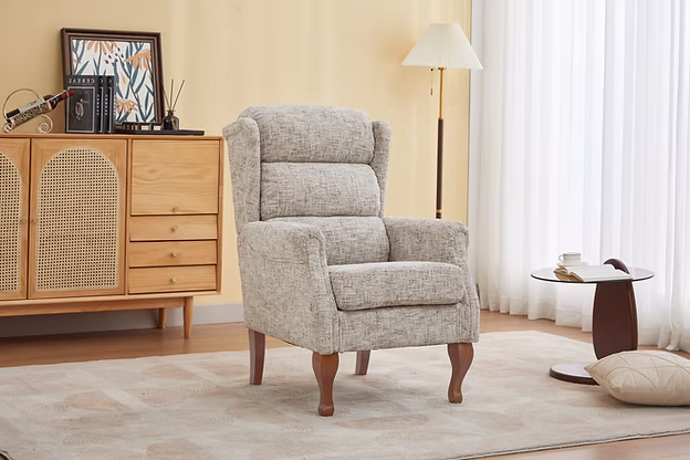 The Nova fireside chair is a traditional style chair with a medium to firm seating with triple back support cushion for your back. Available in two colours a light fabric called frost and a dark fabric called storm both with elegant legs in a mid oak colour.