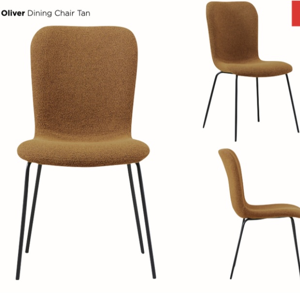 The Oliver dining chair is contemporary and sleek and is available in four fabric colours, dark grey, light grey, tan and ivory, with black metal legs.