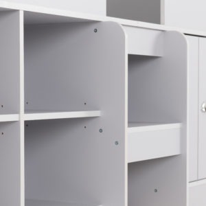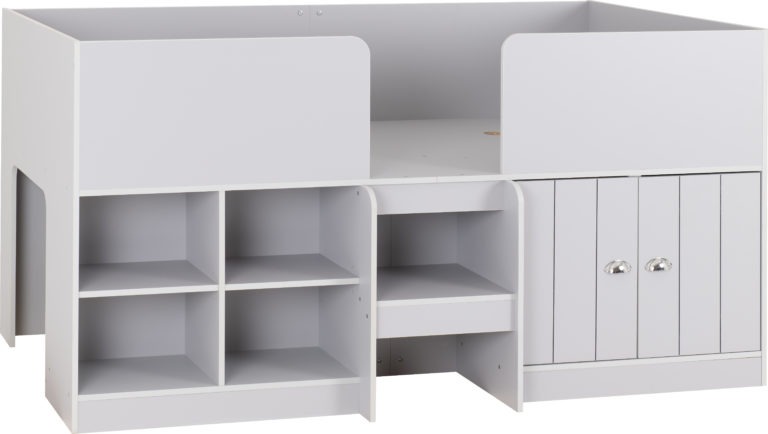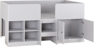 Orlando low sleeper bed, in MDF, dove grey finish, includes cupboard and shelving.