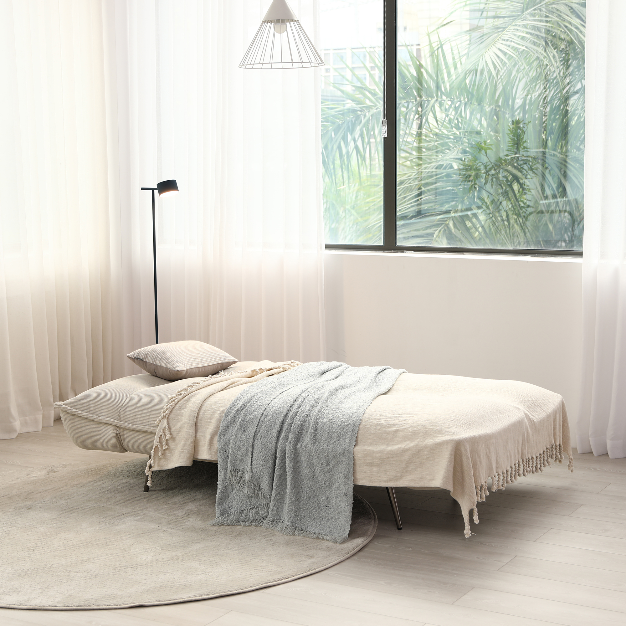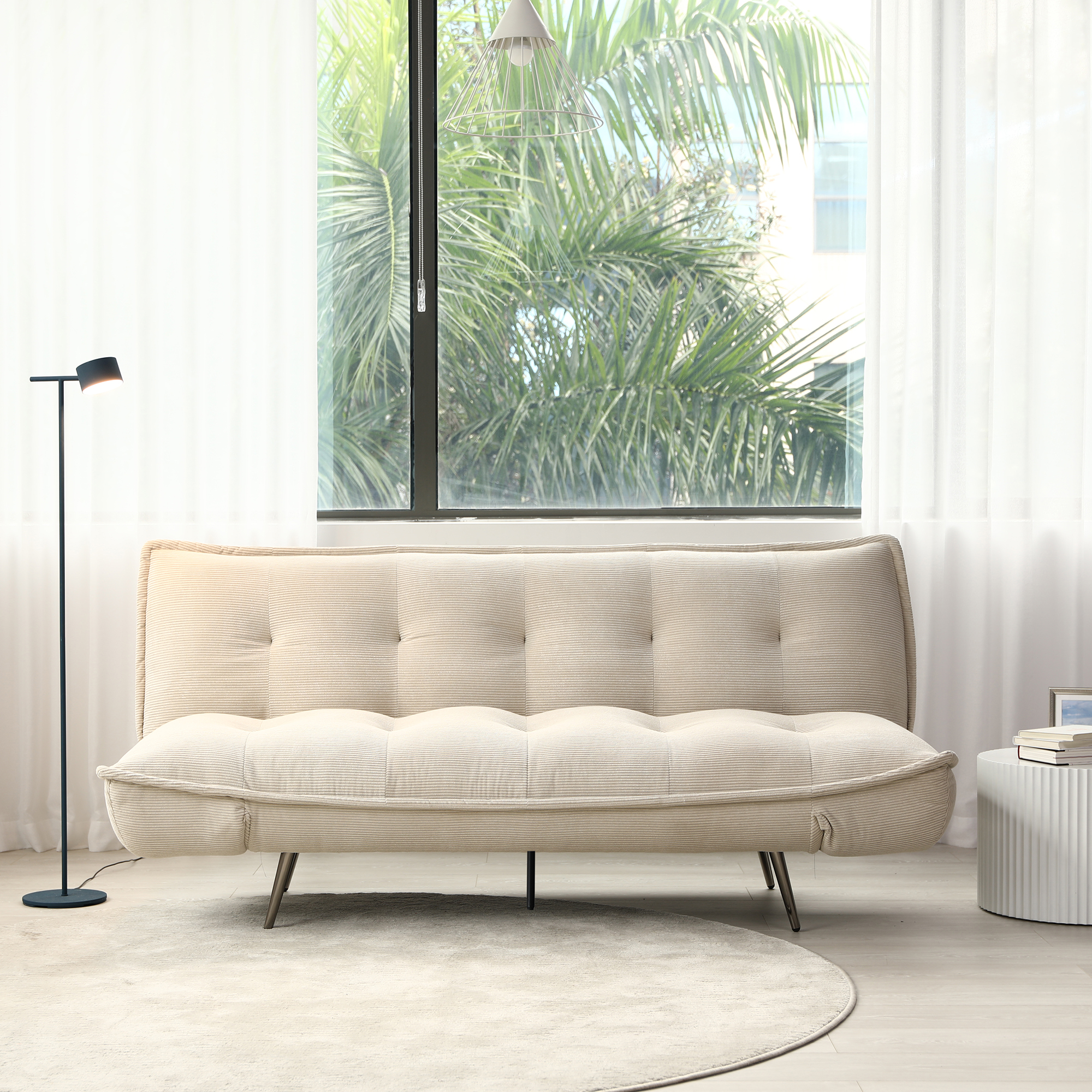 The remy is a new click-clack 3 seater sofa bed designed for modern living. Adjustable arms on both sides allows tailoring of seating experience for your comfort. Standard feature of the sofa bed is the new mechanism which creates a sleek sofa with black chrome angled legs. It is upholstered in a soft teddy fabric in a cream or grey which adds coziness and luxury to the sofa bed. A choice of different positions available when a sofa or a be.