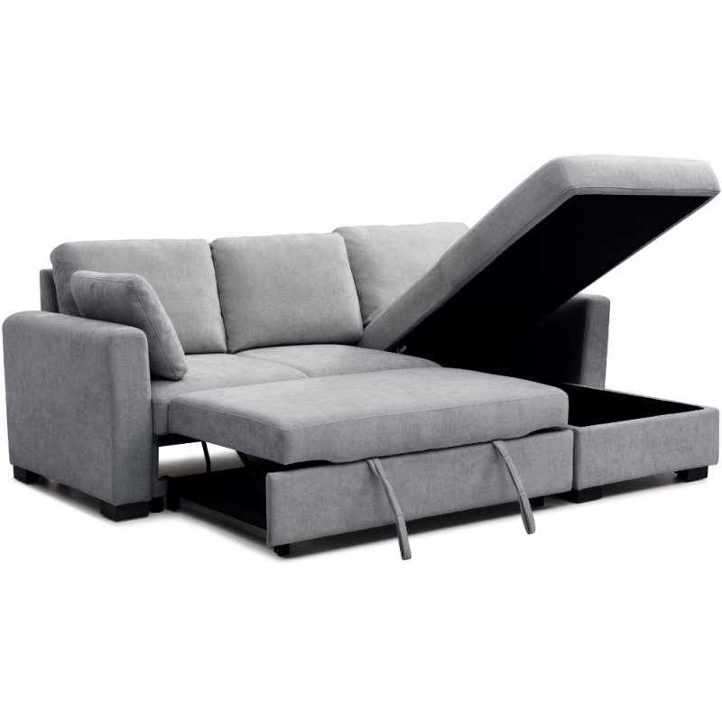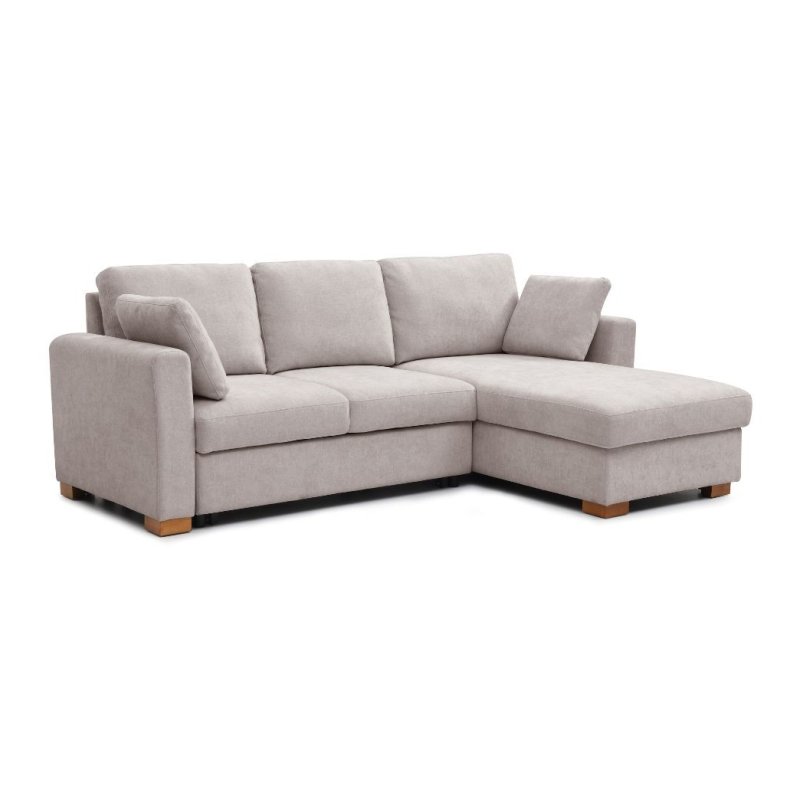 The sorrento corner sofa-bed features a pocket sprung and foam seat, large sleeping area, 2 side cushions and additional storage space under the chaise section. Available in grey, natural and taupe chenille.