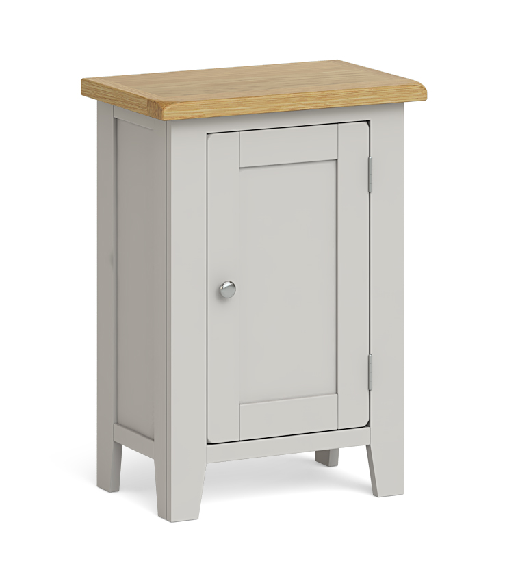 The painted oak living and dining collection features lacquer natural oak tops with rounded edges and a shaker leg, hand painted in soft grey.