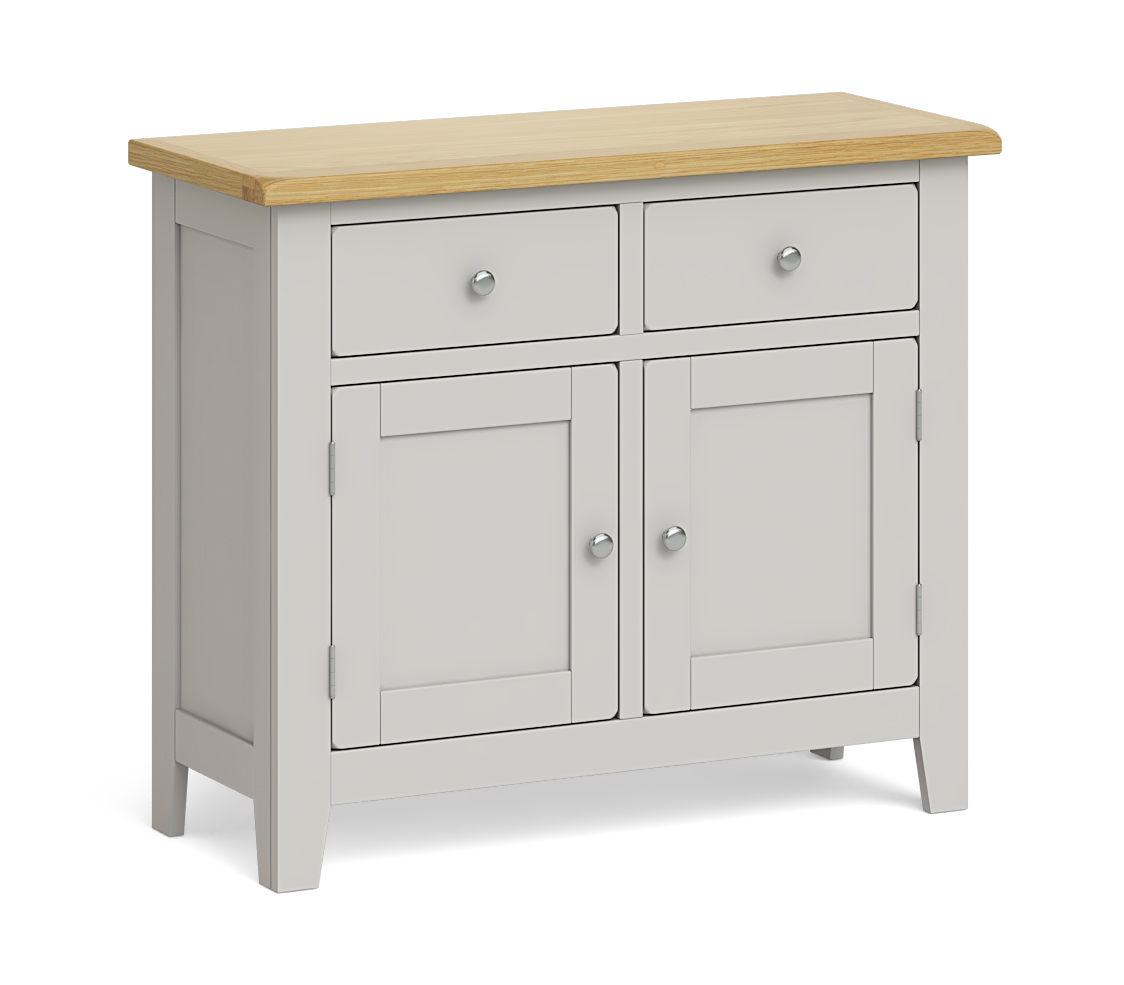 The painted oak living and dining collection features lacquer natural oak tops with rounded edges and a shaker leg, hand painted in soft grey.