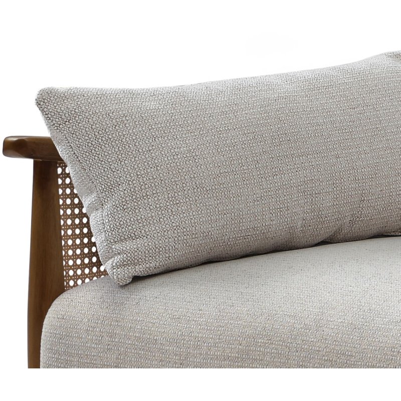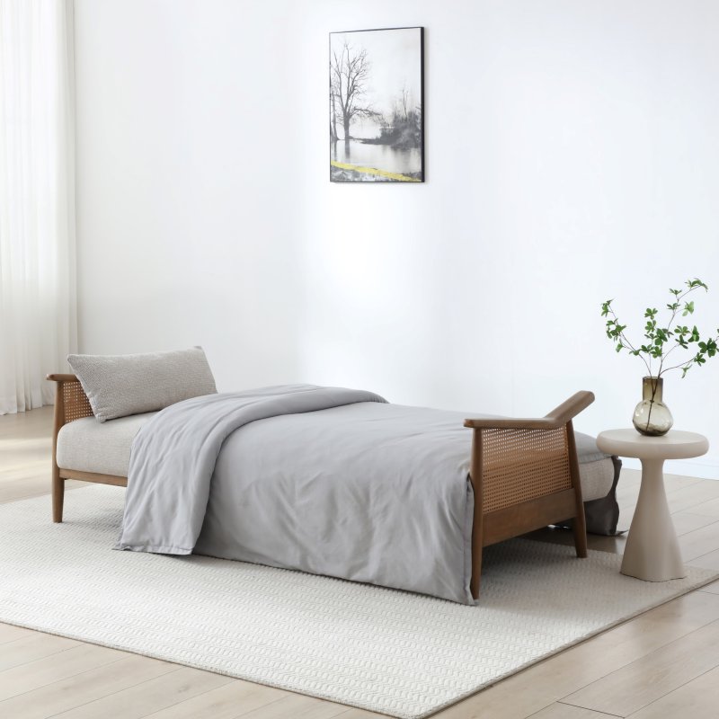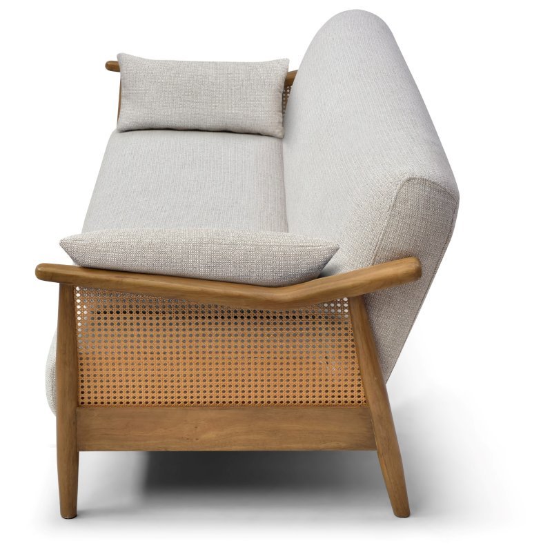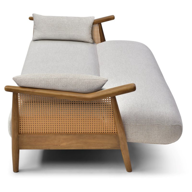 This neat click-clack sofa-bed features eye- catching rattan detailing, complemented by natural show wood along the arms, base and legs. A contemporary take on mid -century design, it combines timeless style with modern functionality and easily converts into a comfortable sleeping area. Upholstered in a beautiful natural textured soft chenille fabric with two removeable side cushions, this sofa-bed would look fabulous in a wide range of decor settings.